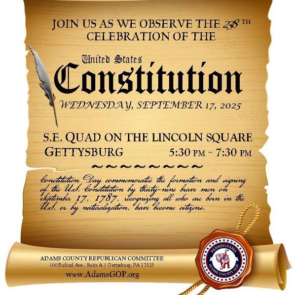 This year, the Adams County Republican Committee will be doing something a little different. Traditionally, we celebrate the U.S. Constitution in Lincoln Square, at the S.E. Quad by the Lincoln Statue. But in light of recent events, our hearts are heavy, and we feel the greater need for healing and unity.